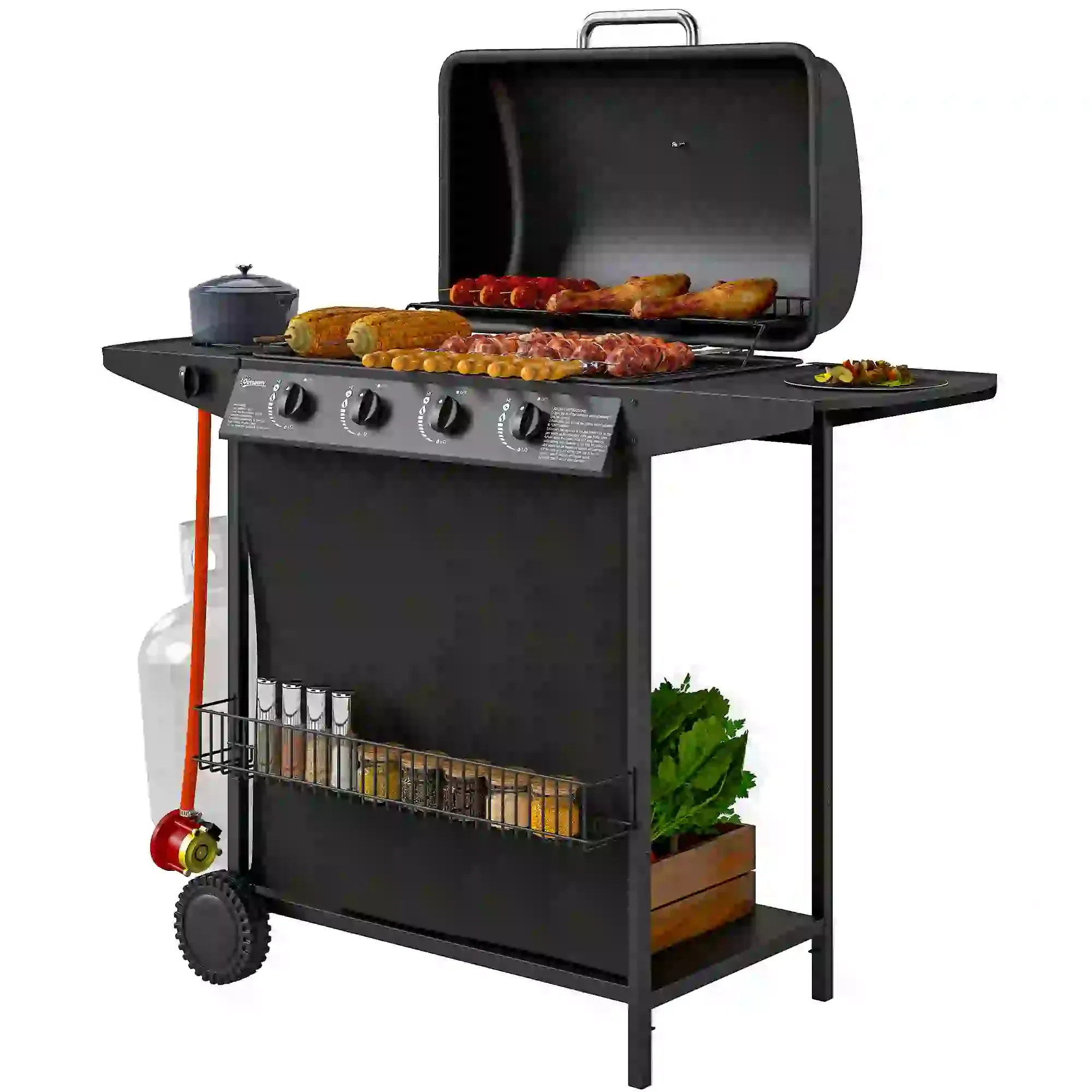 Ignite your garden BBQ with the 5 burner gas BBQ grill! Featuring a spacious 2331 cm² grilling area and a warming rack, you’ll have plenty of space to cook up a feast. The convenient side burner keeps sauces and sides simmering while your main course sizzles to perfection. With individually ignitable and controllable burners and a built-in dual-scale thermometer, achieving optimal grilling temperatures has never been easier!