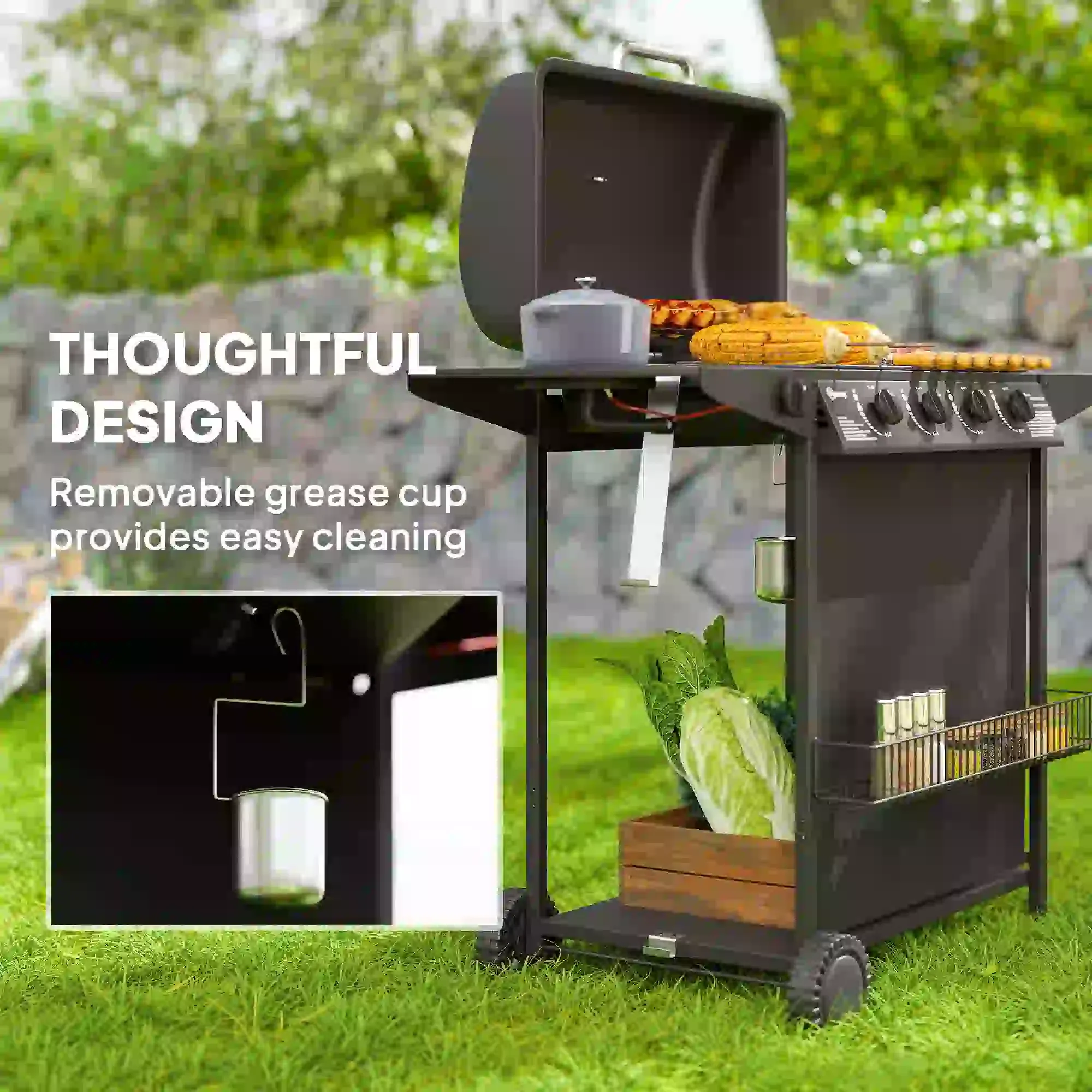 Removable grease cup aids in easy clean-up